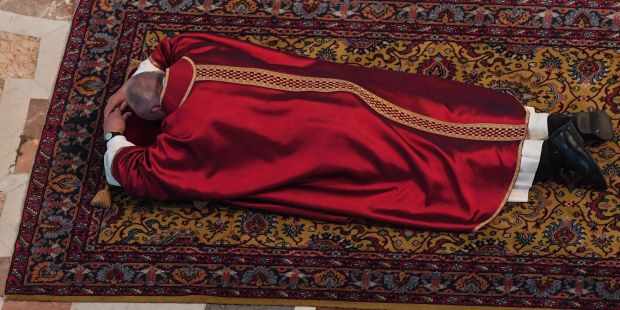La prostration, prosternation ou prosternement, est un geste liturgique rare mais très éloquent: il consiste à s'étendre de tout son long sur le sol pendant le chant de la litanie des saints lors de l'ordination d'un évêque, d'un prêtre, d’un diacre ou lors de la célébration de la Croix le vendredi saint, comme le fait ici le pape François. Il est vécu également par ceux et celles qui font leur profession religieuse définitive en s'engageant devant le Dieu trois fois saint. Nous comprenons de ce fait que l'acte qu'ils et elles vont poser est d'une extrême importance. Cette attitude signifie moins l'anéantissement devant Dieu qu'elle n'exprime la pauvreté de l’être humain face à l ‘Amour sans mesure dont il est aimé gratuitement et un désir de totale disponibilité à sa grâce.